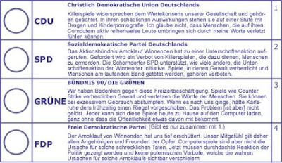 Nicht zu vergessen, die mir vom Wahl-O-Mat empfohlene Piraten-Partei, die dazu wie folgt Stellung nimmt: „Die Killerspieldebatte, wie sie aktuell in Deutschland geführt wird, ist überfrachtet mit Vorurteilen und wird von den konservativen Kräften dazu genutzt von Problemen wie sozialer Verelendung und mangelder pädagogischer Kompetenz im Medienbereich ab zu lenken. […]Der Ruf nach dem Verbot von Herstellung und Vertrieb der Egoshooter wird zur Zeit immer lauter, ein entsprechender Entwurf ist bereits auf Bundesebene eingebracht und im europäischen Ministerrat kann Deutschland bereits mit spanischer Unterstützung rechnen. Wir PIRATEN treten diesen Bestrebungen klar entgegen!“
